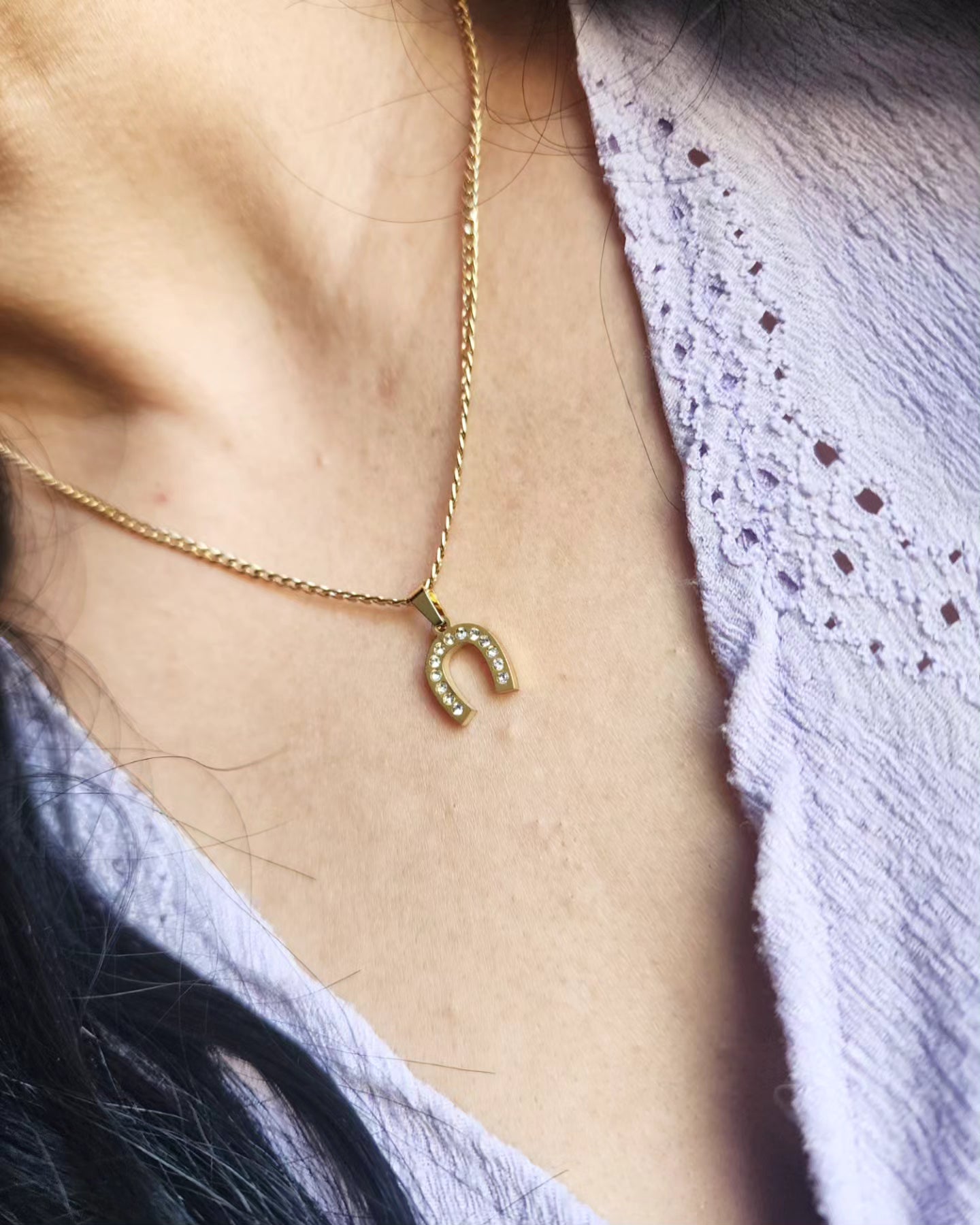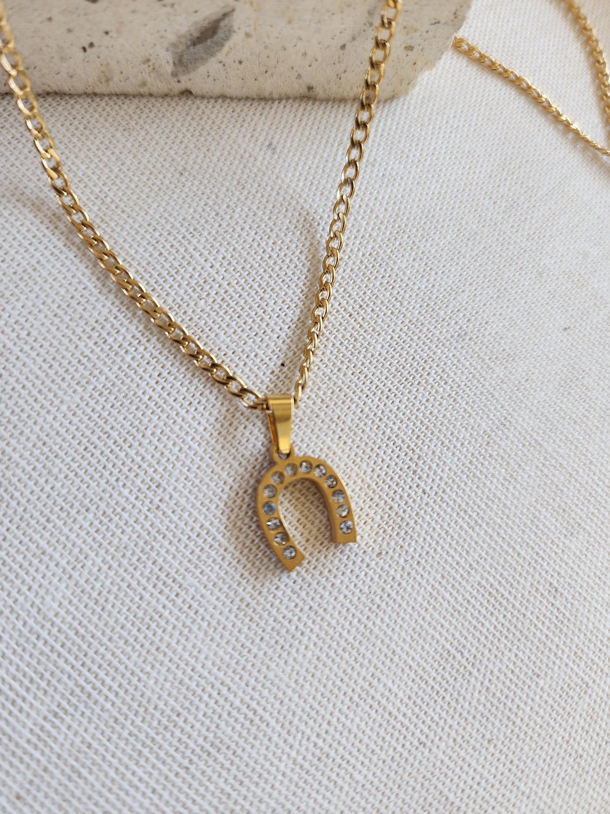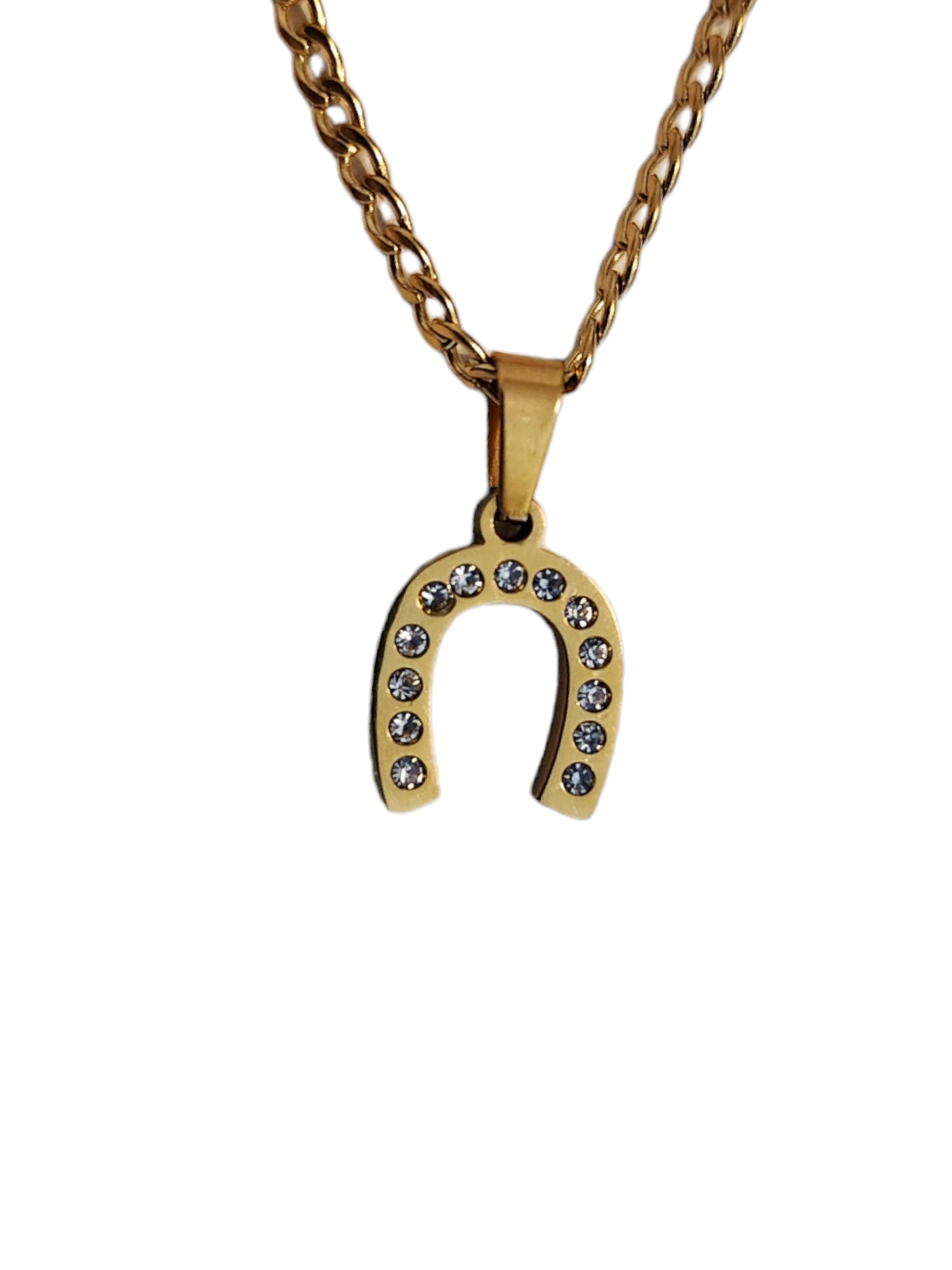 Cadena de acero inoxidable de 45cm de largo y 2cm de ancho con dije de herradura en acero y zirconias de 1cm de largo